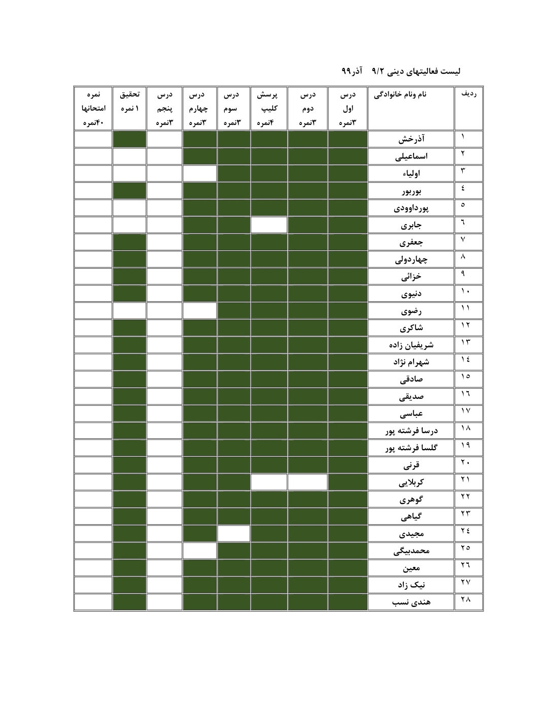 لیست فعالیتهای کلاس دینی 902 آذر ۹۹